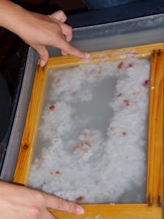 Τοποθετήστε το κόσκινο μέσα στη λεκάνη, χωρίς να καλύπτεται εντελώς από το νερό. Βάλτε τις λωρίδες του χαρτιού στο κόσκινο και πολτοποιήστε το χαρτί με το γουδοχέρι, το blender ή τον μύλο. Η πυκνότητα του μείγματος πρέπει να είναι κάπου ανάμεσα στο χυλό και το γιαούρτι! Ο πολτός θα συγκεντρωθεί μέσα στο κόσκινο, αν και μπορεί να χυθεί και λίγος στο νερό της λεκάνης. Δεν πειράζει!