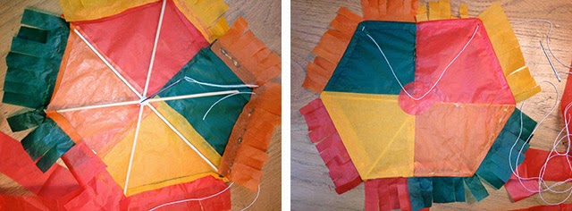 Ξεκινήστε να κόβετε το χαρτί σας προσέχωντας να αφήσετε περιθώριο για να κάνετε το γύρισμα του χαρτιού πάνω στο σκελετό. Πρέπει να είναι μεγαλύτερο απο το σκελετό. Μόλις το κόψετε κολλήστε με την κόλλα το χαρτί γυρίζοντας το πάνω απο το σπάγγο σε κάθε πλευρά. Προσοχή δεν θέλει πολύ κόλλα.