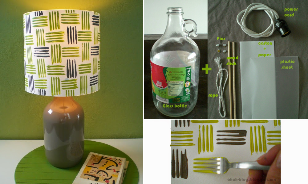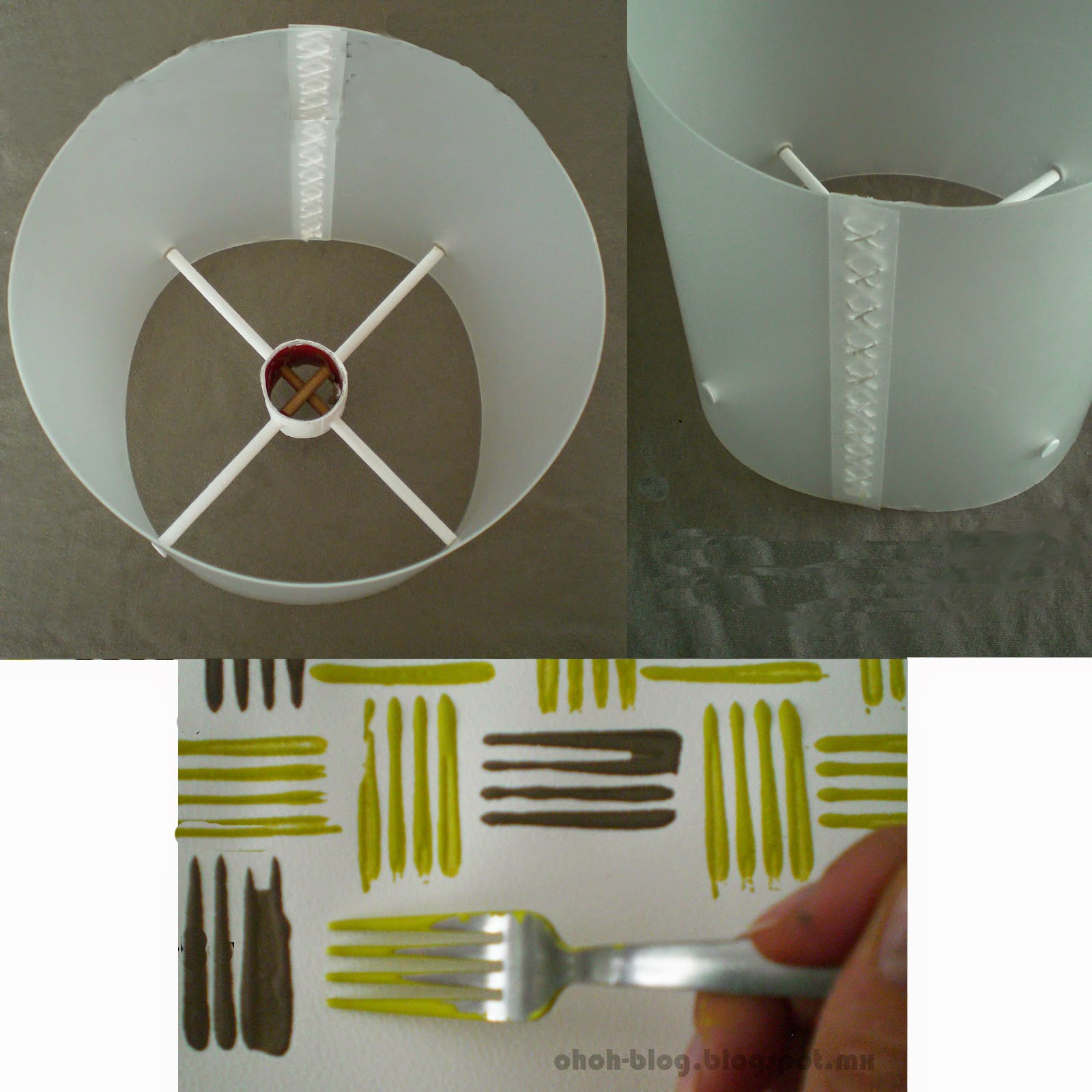 Κόψτε 2 παραλληλόγραμα κομμάτια στο μέγεθος και διάμετρο που θέλετε για το καπέλο του φωτιστικού σας. Ένα απο το κομμάτι του πλαστικού και ένα απο το χαρτί σας. Στη συνέχεια πιάστε το όπως φαίνεται στη φωτογραφία με το σκοινί.