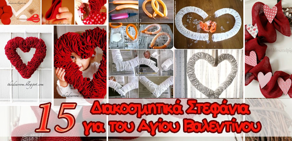Η επόμενη γιορτή που πιθανόν να ανυπομονείτε να γιορτάσετε είναι η Ημέρα του Αγίου Βαλεντίνου. Αυτή τη μέρα είναι γραφτό να την περάσετε με το αγαπημένο σας πρόσωπο, για να γιορτάσετε την αγάπη σας. Μπορείτε να επιλέξετε ενα ρομαντικό προορισμό, ενα δείπνο μόνο για δυο ή να μείνετε σπίτι. Έτσι, στην περίπτωση αυτή φροντίστε να το διακοσμήσετε στο πνεύμα της ημέρας. Ξεκινήστε από την είσοδο και διακοσμήσετε την με ενα υπέροχο στεφάνι. Μπορείτε να βρείτε πολλά στα καταστήματα, αλλά γιατί να μην φτιάξετε ένα μόνοι σας και να του δώσετε τις προσωπικές σας πινελιές. Παρακάτω, έχουμε επιλέξει 15 ιδεές για να δοκιμάσετε να φτιάξετε.