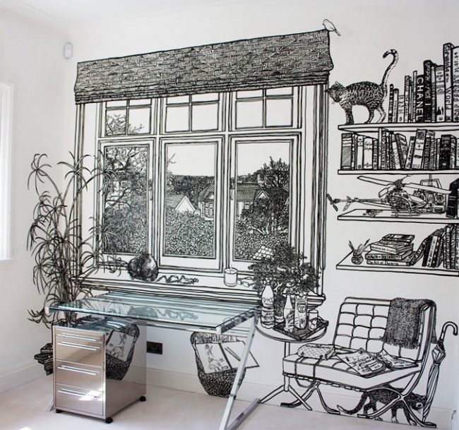 Εναλλακτική της ταπετσαρίας. Σχέδιο με έπιπλα και παράθυρα με μαρκαδόρο πάνω σε τοίχο… Φοβερό!