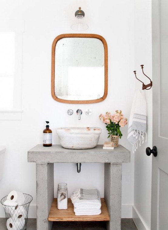 Το μπετόν είναι ένα σούπερ δημοφιλές υλικό λόγω της αντοχής του, της σύγχρονης διακόσμησης και του φθηνού προϋπολογισμού. Είναι ιδανικό για το μπάνιο όπου το σκυρόδεμα χρησιμοποιήθηκε με διάφορους τρόπους για διαφορετικά στυλ διακόσμησης . Μπετόν νεροχύτες και μπανιέρες έχουν ήδη γίνει τάση στο μπάνιο και μπορείτε επίσης να κάνετε ντους τοίχους από μπετόν ή απλά τσιμεντένιους τοίχους αντί για πλακάκια. Το μπετόν ταιριάζει στους σύγχρονους, βιομηχανικούς ή μινιμαλιστικούς χώρους αλλά μπορείτε επίσης να δοκιμάσετε να το ενσωματώσετε σε κάποια άλλα στυλ. Στην χώρα μας η πατητή τσιμεντοκονία δίνει υπέροχα αποτελέσματα και εξαιρετικές αντοχές στην όψη αυτήν του μπετόν. Εμπνευστείτε…