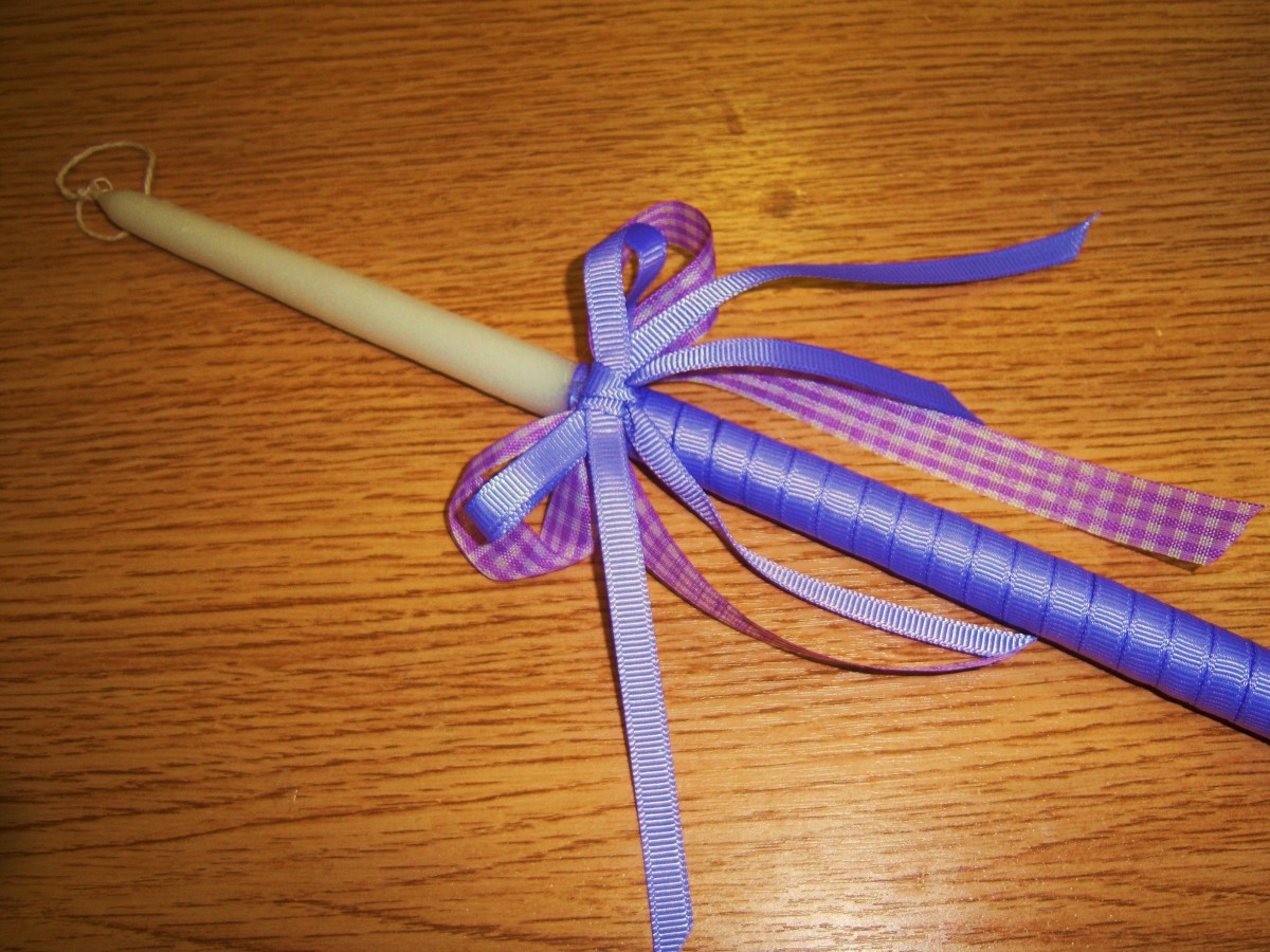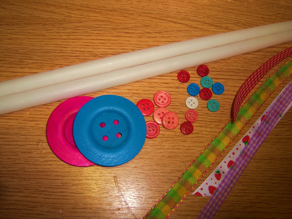 Θα χρειαστείτε: ένα κερί (χρώματος και μεγέθους της αρεσκείας μας), κορδέλες, κουμπάκια και ζεστή σιλικόνη ή κόλλα.