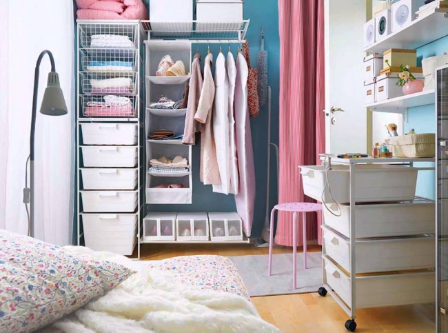 Οι ντουλάπες με τα ανοιχτά ράφια και τα κυλιόμενα συρτάρια ρούχων θα δημιουργήσουν μια αίσθηση ελαφρότητας και τα διαφορετικά κουτιά που θα ταιριάζουν με τη διακόσμηση του δωματίου θα σας βοηθήσουν να έχετε τα πάντα σε τάξη.
