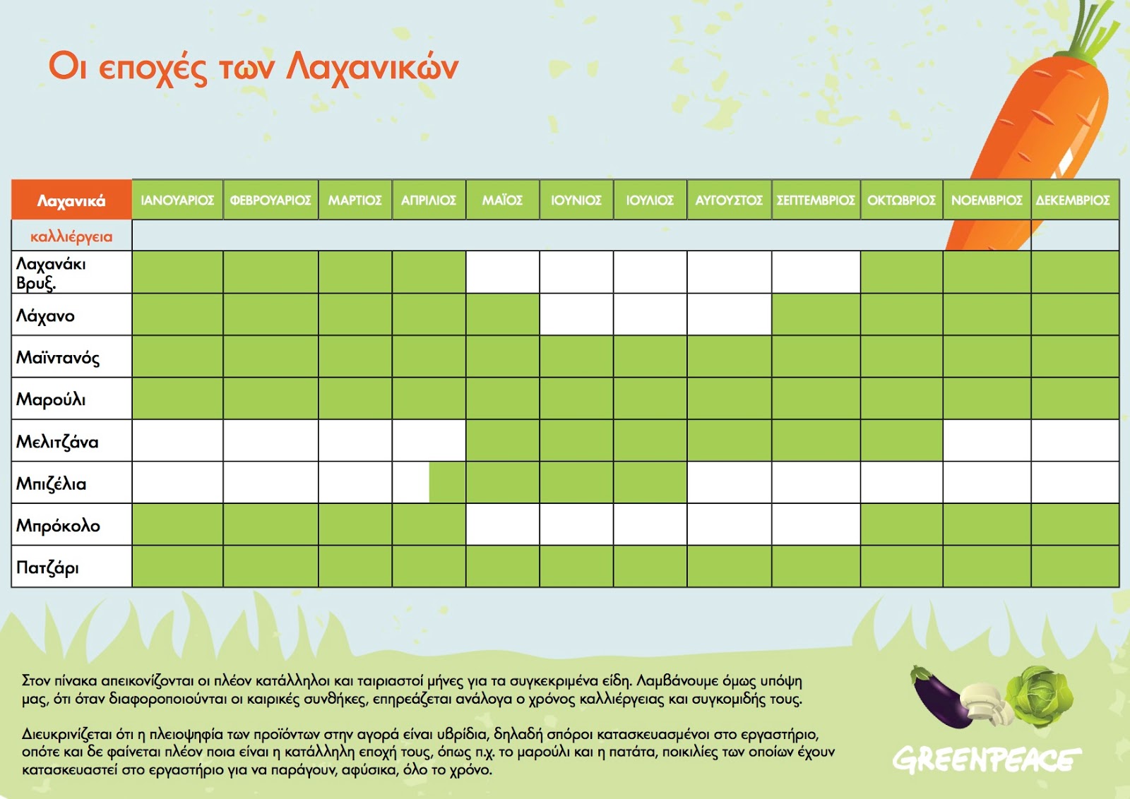 Στον πίνακα εποχικότητας φρούτων και λαχανικών της Greenpeace απεικονίζονται οι πλέον κατάλληλοι και ταιριαστοί μήνες για τα συγκεκριμένα είδη. Λαμβάνουμε όμως υπόψη μας, ότι όταν διαφοροποιούνται οι καιρικές συνθήκες, επηρεάζεται ανάλογα ο χρόνος καλλιέργειας και συγκομιδής τους.