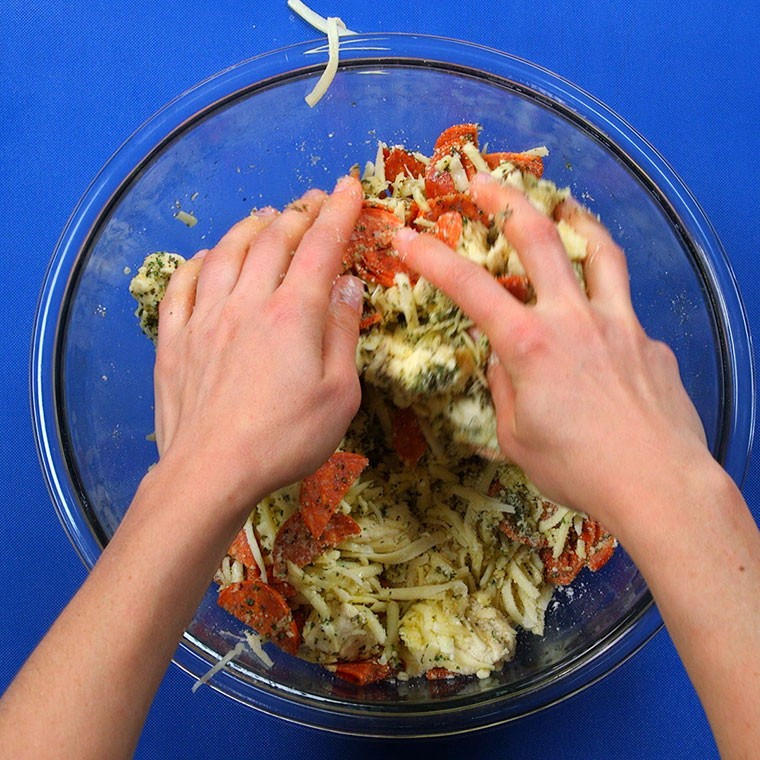 Ανακατέψτε όλα τα υλικά σε ένα μπολ έτσι ώστε το λάδι να απλωθεί ομοιόμορφα σε κάθε κομμάτι της ζύμης.
