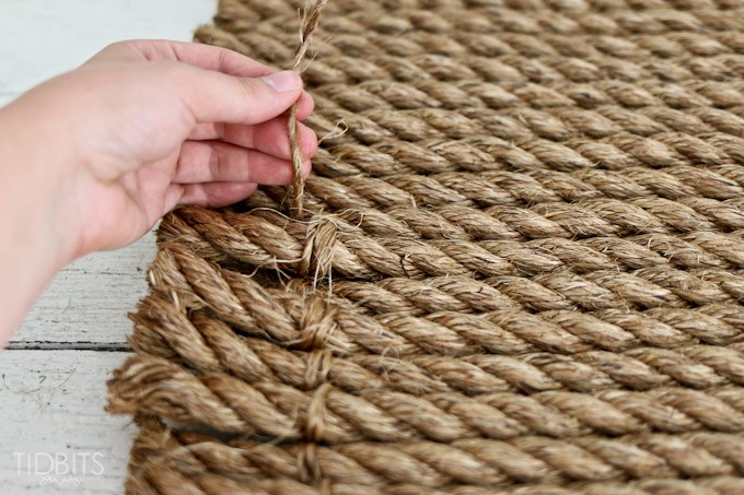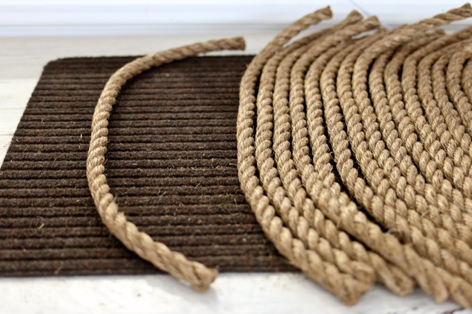 Αφού καλύψετε εντελώς το πατάκι, πάρτε μερικά κομμάτια σκοινί και ξετυλίξτε τις σπείρες για να φτιάξετε μικρότερα νήματα.