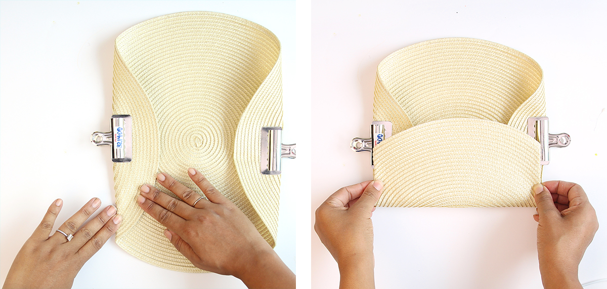 Διπλώστε δυο πλευρές του σουπλά και πιάστε με τα κλιπ. Στρώστε αρκετή κόλλα με το πιστόλι στη μια πλευρά.