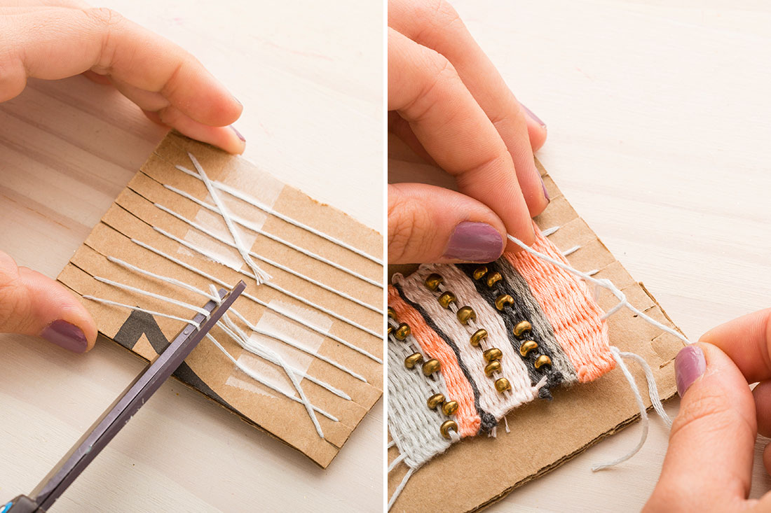 1. Πάρτε το χαρτόνι (5Χ8 εκατοστά) και κόψτε σχισμές ένα εκατοστό περίπου κατά μήκος της μικρής πλευράς του χαρτονιού. Επιλέξτε ένα από τα νήματα και περάστε την μια άκρη του στην πρώτη σχισμή. Εν συνέχεια, περάστε το στην σχισμή ακριβώς απέναντι από την πρώτη. Συνεχίστε την ιδία διαδικασία μέχρι ο χειροποίητος αργαλειός σας να είναι έτοιμος. Κολλήστε με την ταινία τα άκρα στο πίσω μέρος του χαρτονιού.