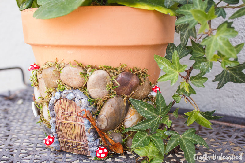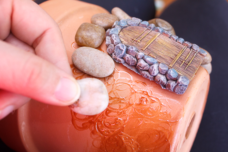 Κολλήστε τις πέτρες και την πόρτα πάνω στη γλάστρα. Μόλις στεγνώσουν, κολλήστε το γρασίδι μεταξύ των κενών. Θα πρέπει να χρησιμοποιήσετε μια ισχυρότερη κόλλα, αν βάλετε τη γλάστρα σε εξωτερικό χώρο ή θέλετε να ποτίζετε τα φυτά μέσα σε αυτήν.