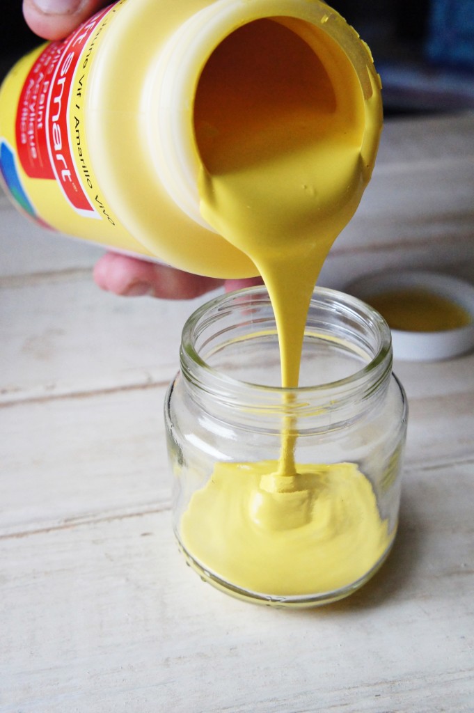 Πρώτα ρίξτε λίγο κίτρινο χρώμα στο εσωτερικό του βάζου και στη συνέχεια κλείστε το με το καπάκι.