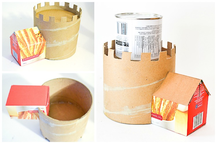 Πάρτε το φαρδύτερο κύλινδρο και κόψτε τι επάλξεις με ένα κοπίδι. Με το πιστόλι κολλήστε ένα χάρτινο κύκλο στο εσωτερικό του κυλίνδρου, περίπου 2,5 εκατοστά κάτω από τις επάλξεις .
