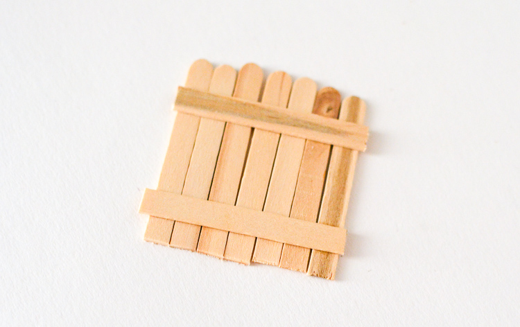 Φτιάξτε μια πόρτα κόβοντας τα ξυλάκια σε ένα ορισμένο μήκος και στη συνέχεια συνδέστε τα μαζί με δύο ξυλάκια και λευκή κόλλα.