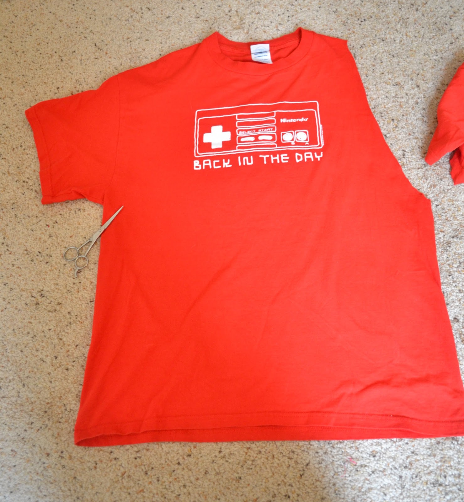 Το πίσω μέρος της μπλούζας όπως φαίνεται μετά το κόψιμο. Μην πετάξετε τα περισσευούμενα κομμάτια της μπλούζας ακόμα.