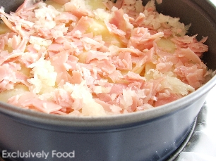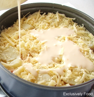 Στρώστε από πάνω με το μισό ζαμπόν και το κρεμμύδι και ρίξτε περίπου το ένα τρίτο του μείγματος των τυριών. Συνεχίστε τις υπόλοιπες στρώσεις με τον ίδιο τρόπο, τελειώνοντας με μια στρώση τυριών.