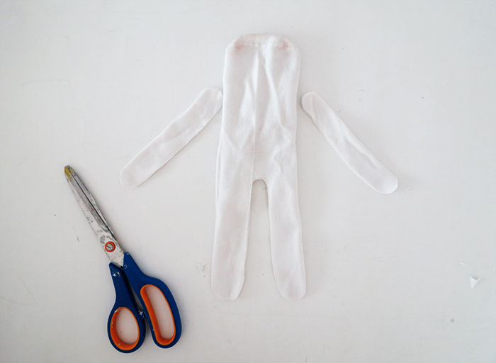 Σχεδιάστε στη μια κάλτσα τα χέρια (αριστερά στην εικόνα) και στην άλλη κάλτσα το σώμα και τα πόδια (δεξιά). Κόψτε τα κομμάτια της κούκλας.