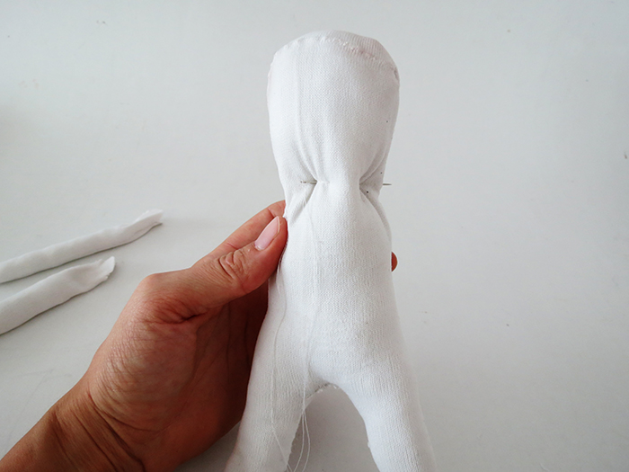 Ράψτε τις άκρες των ποδιών, αφήνοντας ένα άνοιγμα στο κέντρο τους για να γεμίσετε την κούκλα. Ράψτε τις άκρες των χεριών, αφήνοντας μία πλευρά ανοιχτή για να προσθέσετε τη γέμιση. Γεμίστε το σώμα και τα χέρια της κούκλας.