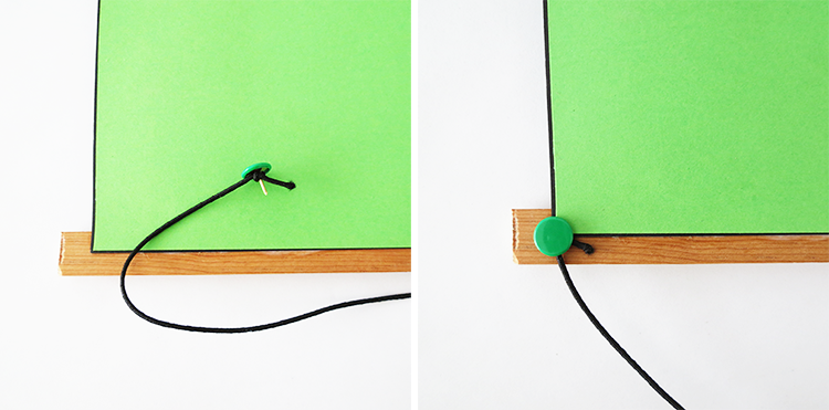 Για να κρεμάσετε το έργο τέχνη σας, κόψτε ένα κομμάτι κορδόνι, πάρτε δυο πινέζες, κάντε ένα κόμπο γύρω από αυτές και καρφώστε τις στις άκρες της πάνω ράβδου.