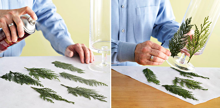 Ψεκάστε τα φύλλα με το σπρέι και κολλήστε τα πάνω στο ποτήρι.