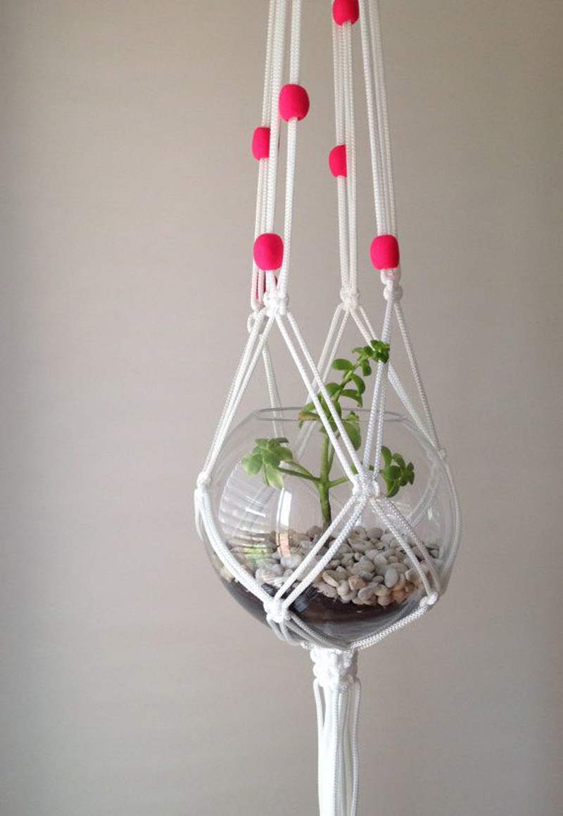 Η τεχνική μακραμέ είναι ιδανική για την κατασκευή διακοσμητικών αντικείμενων και αξεσουάρ. Αν αγαπάτε την κηπουρική, αλλά δεν έχετε κανένα ανοιχτό χώρο για τα φυτά σας, σκεφτείτε έναν κήπο, όπου τα φυτά σας θα κρέμονται μέσα σε μικρές γλάστρες από κασπό μακραμέ. Δείτε τις παρακάτω ιδέες για να εμπνευστείτε, χρησιμοποιώντας μια ποικιλία υλικών όπως σχοινί, κορδόνι, δέρμα, ακόμη και κοντομάνικα μπλουζάκια. Συνιστάται να βγάζετε τη γλάστρα για πότισμα ώστε να μην βάψει το κρεμαστό.