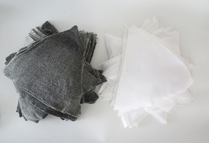 Πρώτα κόψτε όλα τα τρίγωνα, πράγμα που σημαίνει 120 κομμάτια! Χρησιμοποιήστε ένα χάρτινο ισόπλευρο τρίγωνο (πλευρας 50 εκ.) για να μαρκάρετε τα κομμάτια πάνω στο ύφασμα.