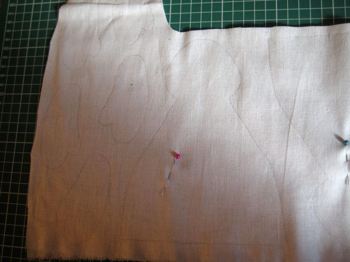 Τυλίξτε το ύφασμα στη μέση από την ανάποδη και σχεδιάστε το σώμα και τα χέρια. Πιάστε τα με καρφίτσες αλλά μην τα κόψετε. Ράψτε το περίγραμμα, αφήνοντας ανοικτά το κάτω μέρος του σώματος, δύο εκατοστά στην μια πλευρά και ένα μικρό κενό στους βραχίονες (όπως φαίνεται στο σχέδιο). Κόψτε τα κομμάτια από το ύφασμα αφήνοντας τα κενά ανοικτά.