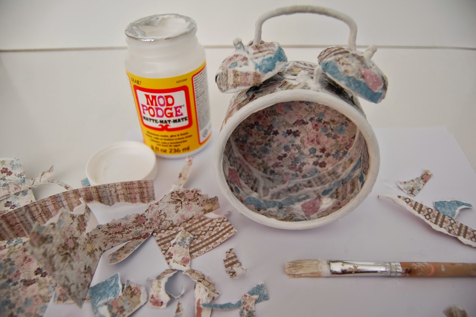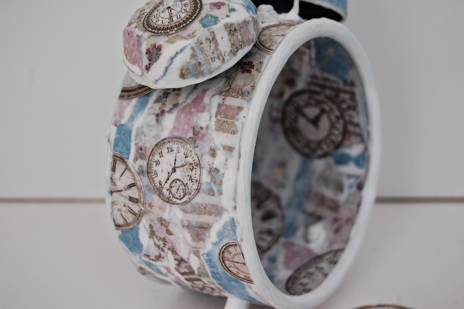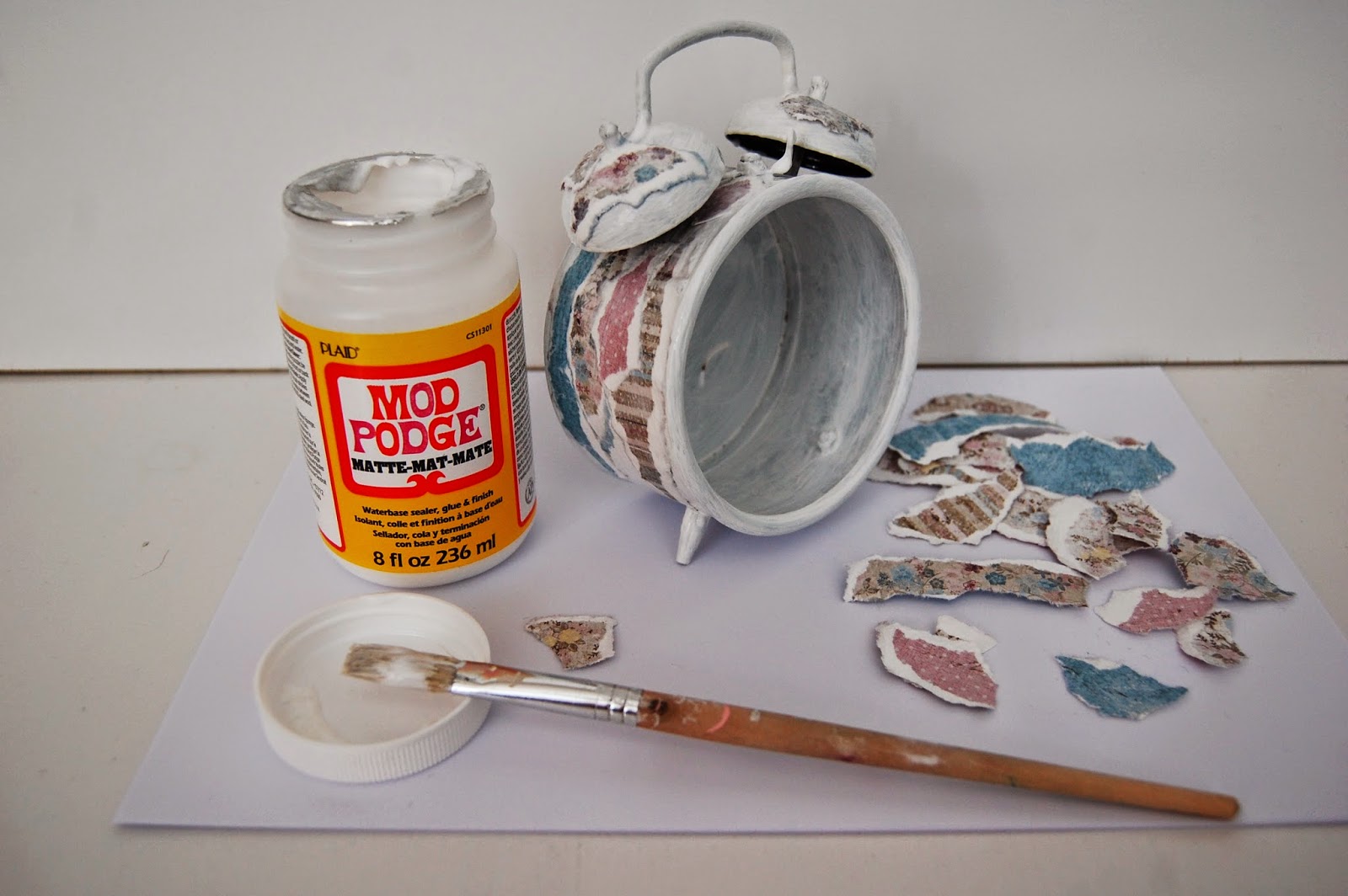 Κολλήστε τα χαρτιά στο ξυπνητήρι με Mod podge ή με λευκή κόλλα χειροτεχνίας.