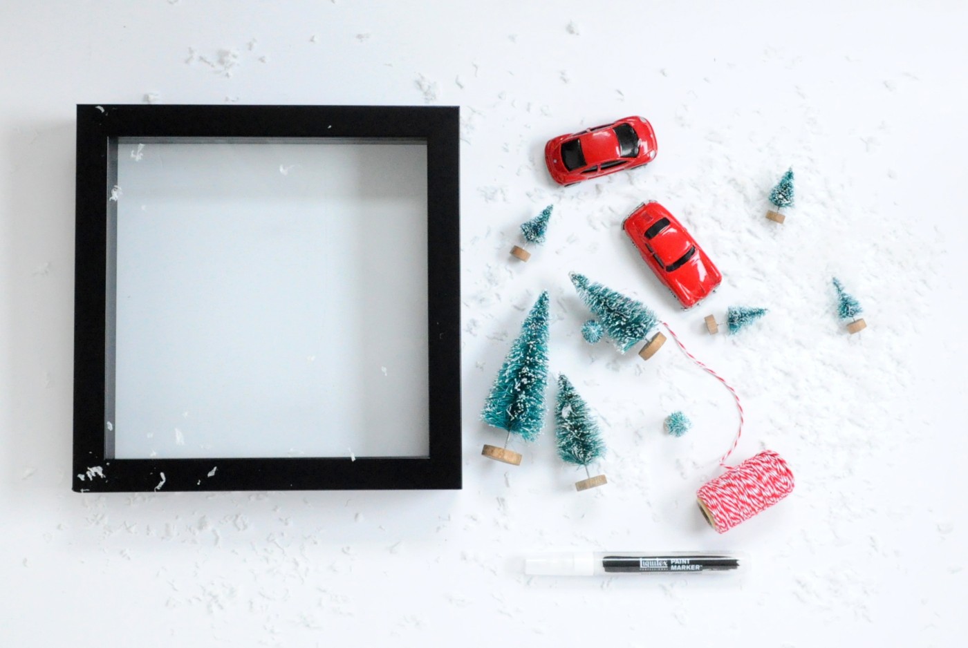 Ξεκινήστε τοποθετώντας τις μινιατούρες μέσα στη κορνιζά και χρησιμοποιήστε λίγη κόλλα για να τα κρατήσετε στη θέση τους. Πασπαλίστε όλο το σκηνικό με το χιόνι.