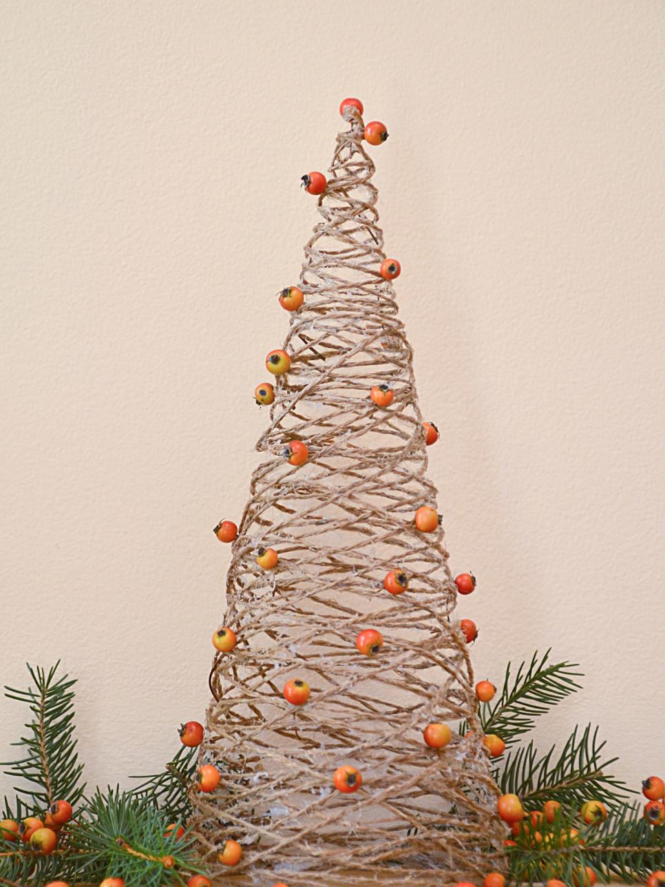 Καλύψτε ένα κώνο από φελιζόλ με πλαστική μεμβράνη για να φτιάξετε το καλούπι για το δέντρο. Βουτήξτε επιμήκη κομμάτια χοντρού σπάγγου σε λευκή κόλλα και τυλίξτε τα γύρω από τον κώνο, φροντίζοντας τα κομμάτια να επικαλύπτονται. Όταν η κόλλα στεγνώσει τραβήξτε απαλά το καλούπι. Διακοσμήστε το δέντρο σας με φωτεινά κόκκινα μούρα.