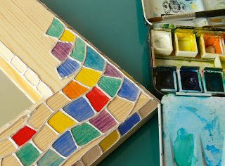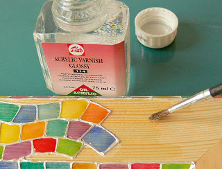 6. Τα χρώματα ακουαρέλας θα δημιουργήσουν ένα χαρούμενο φωτεινό μωσαϊκό. Μπορείτε να αφήσετε μερικά τετράγωνα άβαφτα ώστε όταν βάλετε το βερνίκι να μοιάζουν με διαφανές γυαλί.