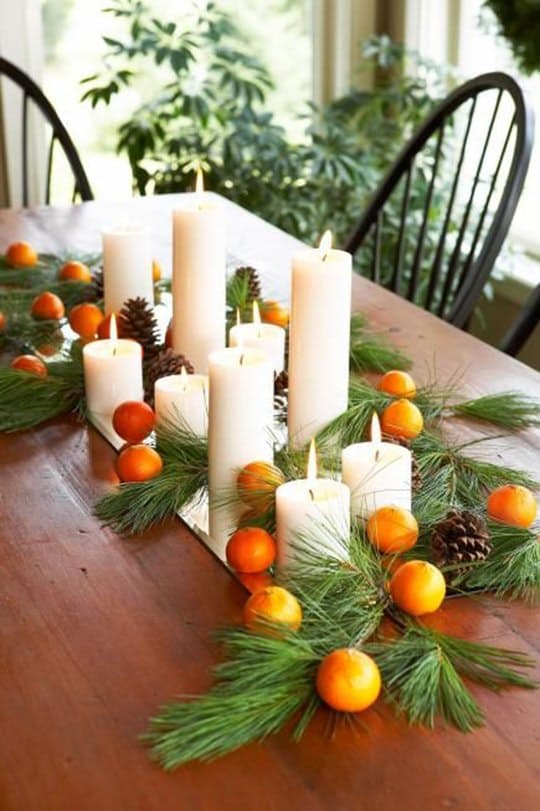 Συνδυάστε μανταρίνια, πευκόφυλλα, κουκουνάρια και κεριά για μια όμορφη εμφάνιση.