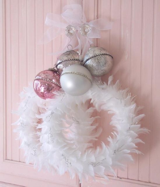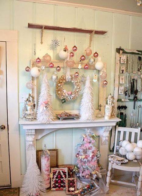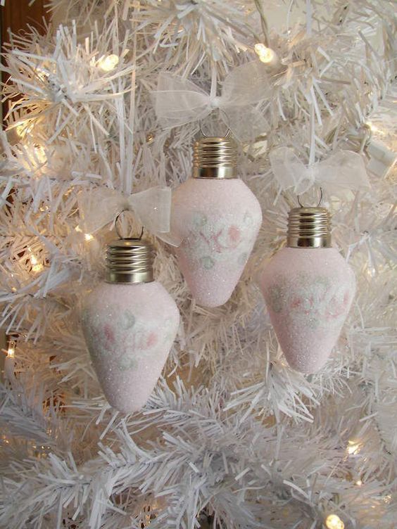 Παστέλ, περλέ, λευκές και ιβουάρ αποχρώσεις είναι αυτό που χρειάζεστε για τα στολίδια. Φτιάξτε τα δικά σας με δαντέλες και πετσετάκια, δημιουργήστε μοτίβα λουλουδιών, προσθέστε πέρλες, χάντρες και λουλούδια. Παλιομοδίτικες λάμπες μπορεί να μετατραπούν σε όμορφα χιονισμένα στολίδια και να φτιάξετε στολίδια καραμέλες από πηλό.