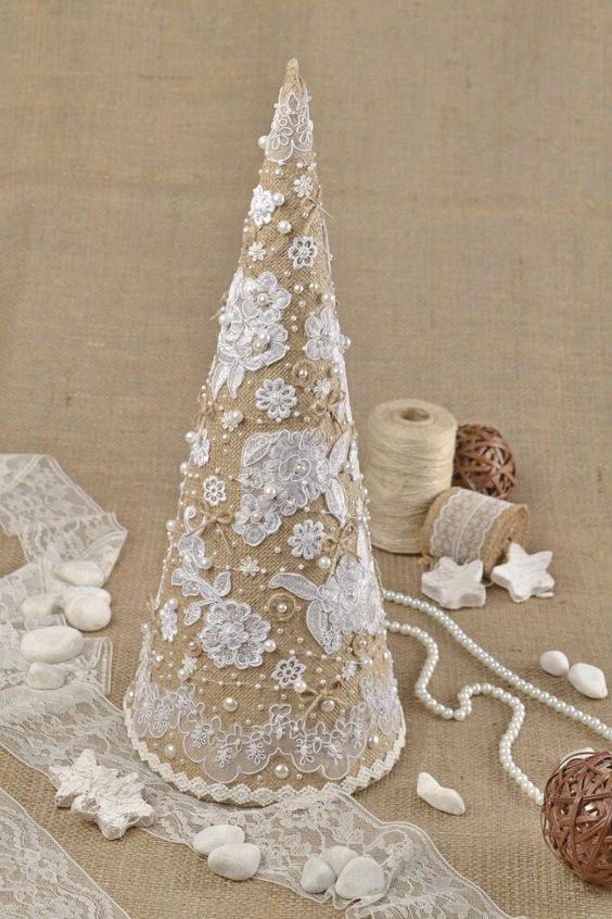 Για να πέτυχετε μια εκλεπτυσμένη εμφάνιση με πολύπλοκα σχέδια χρησιμοποιήστε τεχνητά φουντωτά δέντρα σε λευκό, ασημί ή ροζ διακοσμημένο με στολίδια σε παστέλ αποχρώσεις. Vintage πέρλες και χάντρες θα ολοκληρώσουν τέλεια τη διακόσμηση. Μια άλλη ιδέα είναι να στολίσετε το δέντρο με σεμέν, λινάτσα, δαντέλες ,πέρλες, στολίδια και χάντρες ή οποιοδήποτε άλλο υλικό. Χρησιμοποιήστε παλιά κοσμήματα για να δώσετε λάμψη χωρίς φώτα! Αν δεν έχετε αρκετό χώρο για ένα δέντρο ή απλά θέλετε ένα επιπλέον, φτιάξτε το με κουμπιά, κοσμήματα και χάντρες.