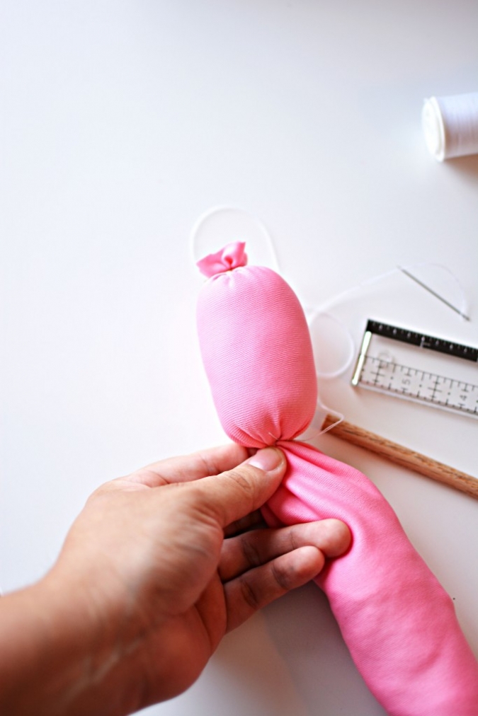 5. Για το κεφάλι βάλτε μια μικρή ποσότητα γέμισης και σπρώξτε τη με τη ράβδο. Γεμίστε μέχρι περίπου 8 εκατοστά. Ράψτε σφιχτά για δυνατό κράτημα.
