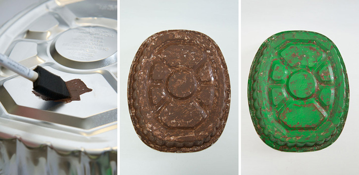 1. Χρησιμοποιήστε το καφέ χρώμα και ταμπονάρετε το πινέλο πάνω στο καβούκι για μια όψη σφουγγαριού. Αφήστε το να στεγνώσει 20 λεπτά. Στη συνέχεια, προσθέστε το πράσινο χρώμα χρησιμοποιώντας την ίδια τεχνική.