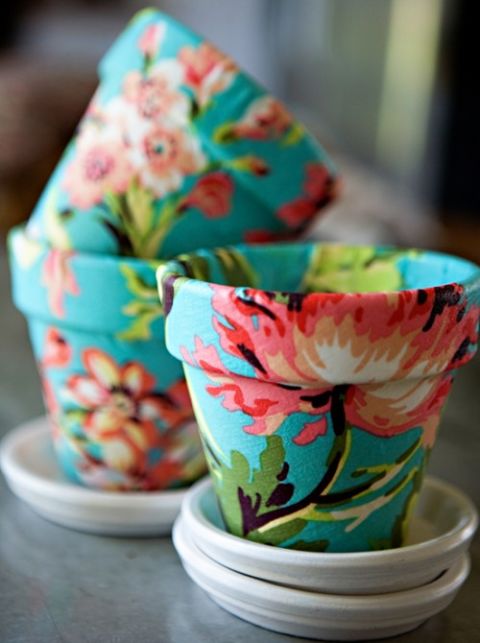 2. Πάρτε μερικά κομμάτια ύφασμα και με τη τεχνική decoupage αλλάξετε όχι μόνο το χρώμα αλλά την υφή της γλάστρας.