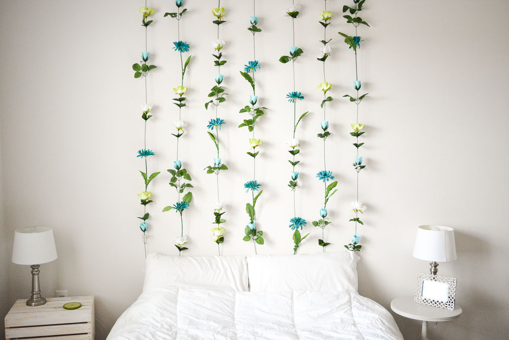 Αφού τελειώσετε με τις σειρές των λουλουδιών, δέστε μια θηλιά από πετονιά γύρω από το επάνω λουλούδι της σειράς. Στη συνέχεια, βάλτε ένα μικρό καρφί ή πιέστε μια πινέζα στον τοίχο κοντά στην οροφή και κρεμάστε την πετονιά σε αυτό. Έτσι τα λουλούδια θα φαίνονται ότι αιωρούνται.