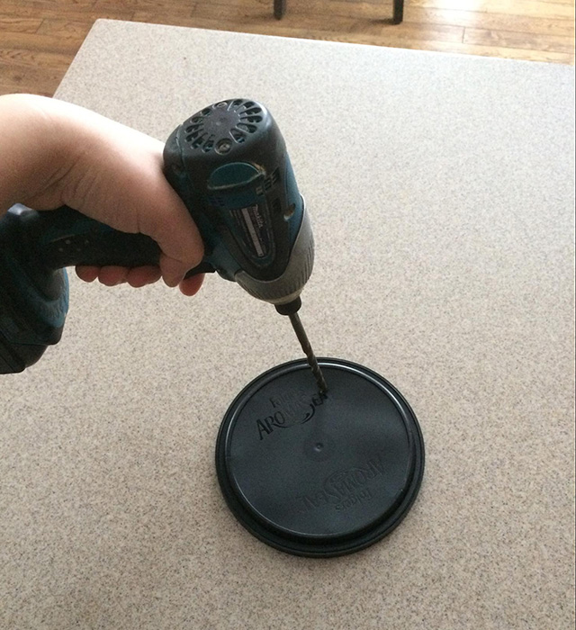 2. Με το τρυπάνι ανοίξτε τρύπες στο καπάκι. 8-10 αρκούν. Με τα χέρια ή με ψαλίδι κόψτε τυχόν προεξέχουσα κομμάτια από το τρύπημα.