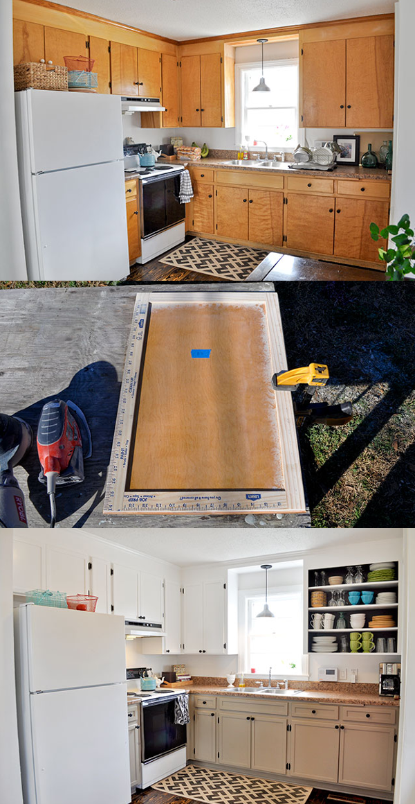 Μεταμορφώστε τα παλιά ντουλάπια κουζίνας με ξύλινα πηχάκια και μια στρώση χρώματος.