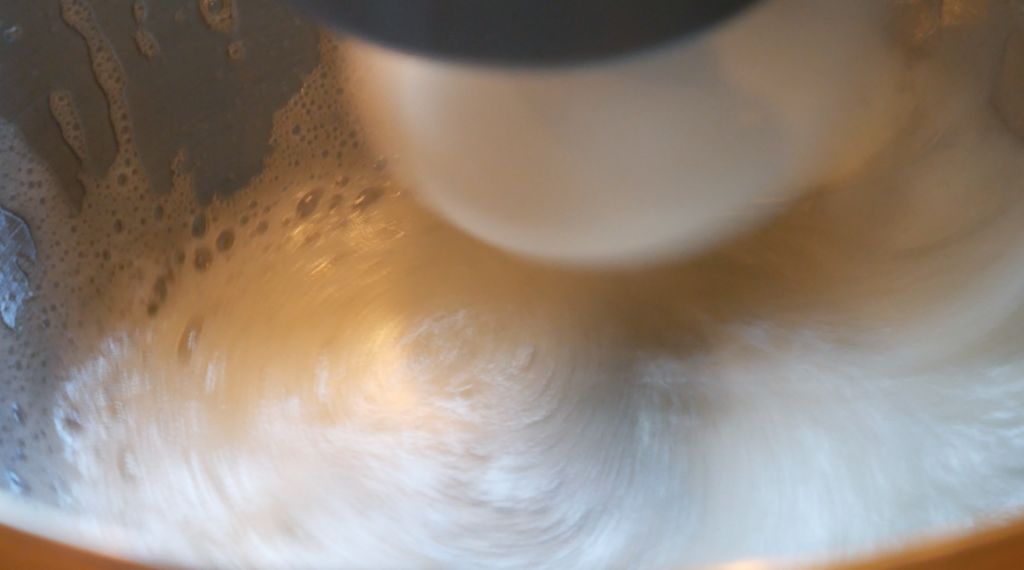 Προσθέστε τα ασπράδια και το αλάτι σε ένα μίξερ και χτυπήστε σε μέτρια ταχύτητα μέχρι να γίνει λευκό και αφρώδες μείγμα.