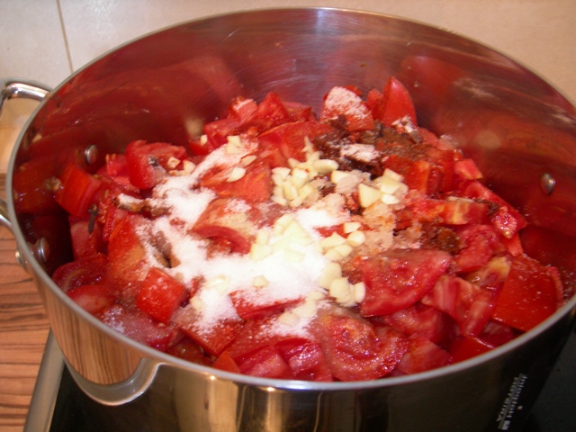 Πλένουμε καλά τις ντομάτες και τις ψιλοκόβουμε. Τις βάζουμε σε βαθιά κατσαρόλα, με βαρύ πάτο καλύτερα.
