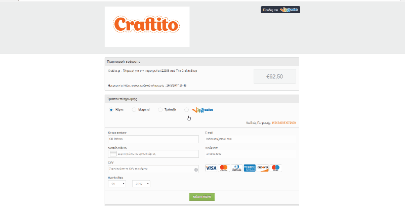 Όταν πατήσετε πληρωμή θα εμφανιστούν τα στοιχεία σας καθώς και όλα τα στοιχεία που αφορούν την παραγγελία σας, όπως τιμή, Φ.Π.Α, μεταφορικά κτλ.