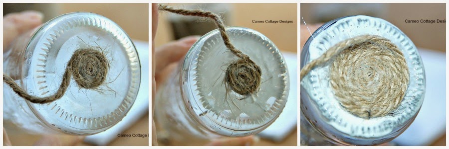 Τώρα για να φτιάξουμε το πάτο ξεκινάμε να τυλίγουμε ένα κομμάτι σπάγκου και βάζουμε κόλλα. Αφού γίνει αρκετά μεγάλο βρίσκουμε το κέντρο του πάτου του μπουκαλιού βάζουμε ένα καλό στρώμα κόλλας και κολλάμε. στη συνέχεια συνεχίζουμε να το τυλίγουμε μέχρι να φτάσει το επιθυμητό μέγεθος για τον πάτο μας. Στο τύλιγμα του σπάγκου δεν ξεχνάμε να βάζουμε κόλλα.