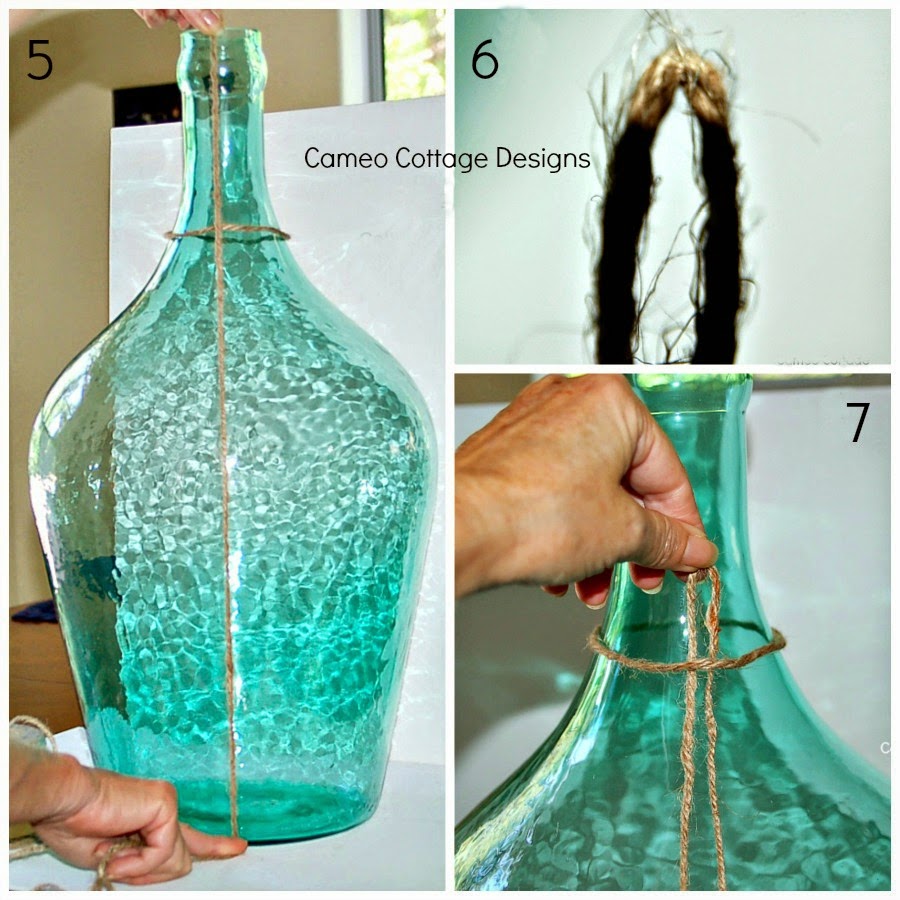 Τοποθετήστε το δαχτυλίδι στο λαιμό του μπουκαλιού. Τώρα με το σπάγκο μετρήστε απο την κορυφή εως τον πάτο και πολλαπλασιάστε το ύψος επι 4. Δηλαδή εαν το ύψος είναι 10 εκ. κόψτε ένα κομμάτι 40 εκατοστά. Καλύτερα να περισσέψει και λίγο παρά να μην σας φτάσει στο τέλος. Στη συνέχεια αφού έχετε μετρήσει το μήκος του ενός κόψτε 6 ίδια κομμάτια.