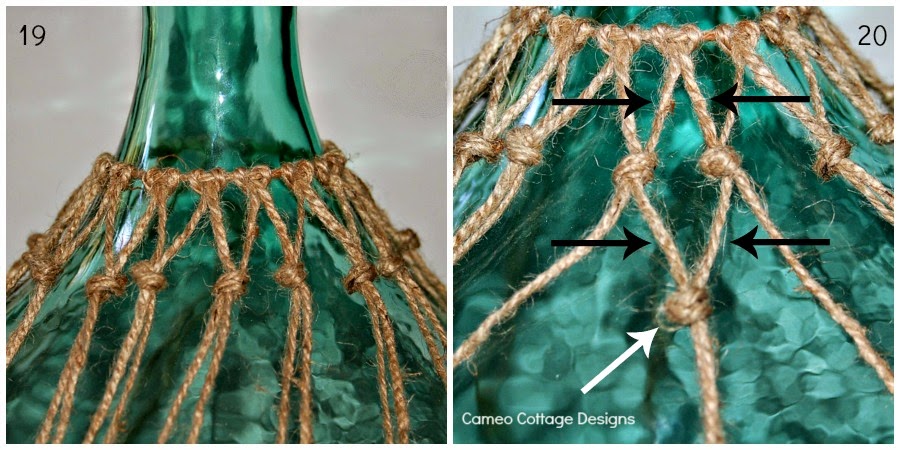 Στη συνέχεια τραβήξτε κάθε ζευγάρι απο τα σκοινιά των κόμπων και κολλήστε τα στο κέντρο του πάτου με το θερμοκολλητικό πιστόλι για να σταθούν. Μην τραβήξετε πολύ δυνατα και σας χαλάσει το σχέδιο των κόμπων ή στραβώσουν. Εαν χρειαστεί φτιάξτε τους.
