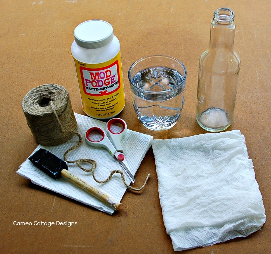 Τυλίξτε στη μέση το πρώτο κομμάτι σπάγκου, περάστε το απο το δαχτυλίδι στο λαιμό του μπουκαλιού και δέστε το όπως φαίνεται παρακάτω στις φωτογραφίες.