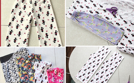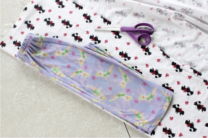 θα χρησιμοποιήσουμε ένα παντελόνι πιτζάμας παλιό αρκεί να ταιριάζει σε μέγεθος σε αυτόν που θα το φορέσει. Διπλώστε στη μέση την πιτζάμα και τοποθετήστε τη στο επίσης διπλωμένο ύφασμα