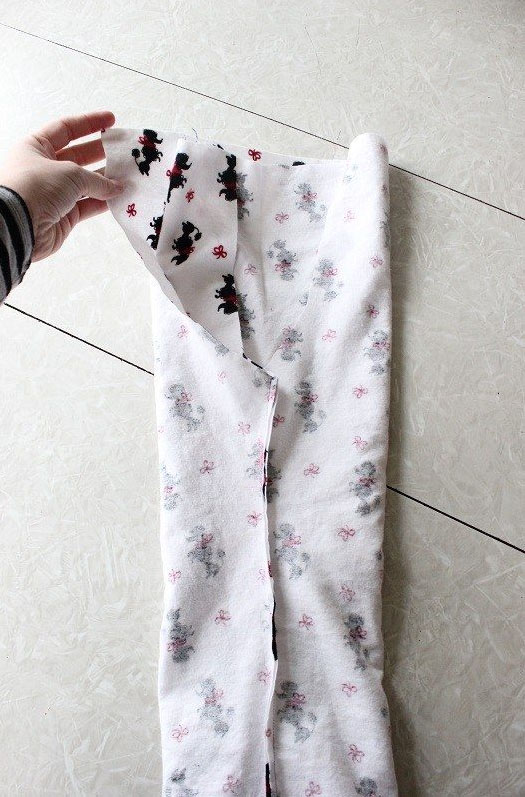 Γυρίστε το ένα πόδι με την καλή πλευρά έξω και γεμίστε με αυτό το άλλο πόδι. Η καλή πλευρά του υφάσματος θα είναι απέναντι στην άλλη. Βεβαιωθείτε ότι η μακριά ραφή που μόλις ράψατε σε κάθε πόδι ταιριάζει η μια με την άλλη. Καρφιτσώστε στο κέντρο για να κρατηθεί στη θέση του.