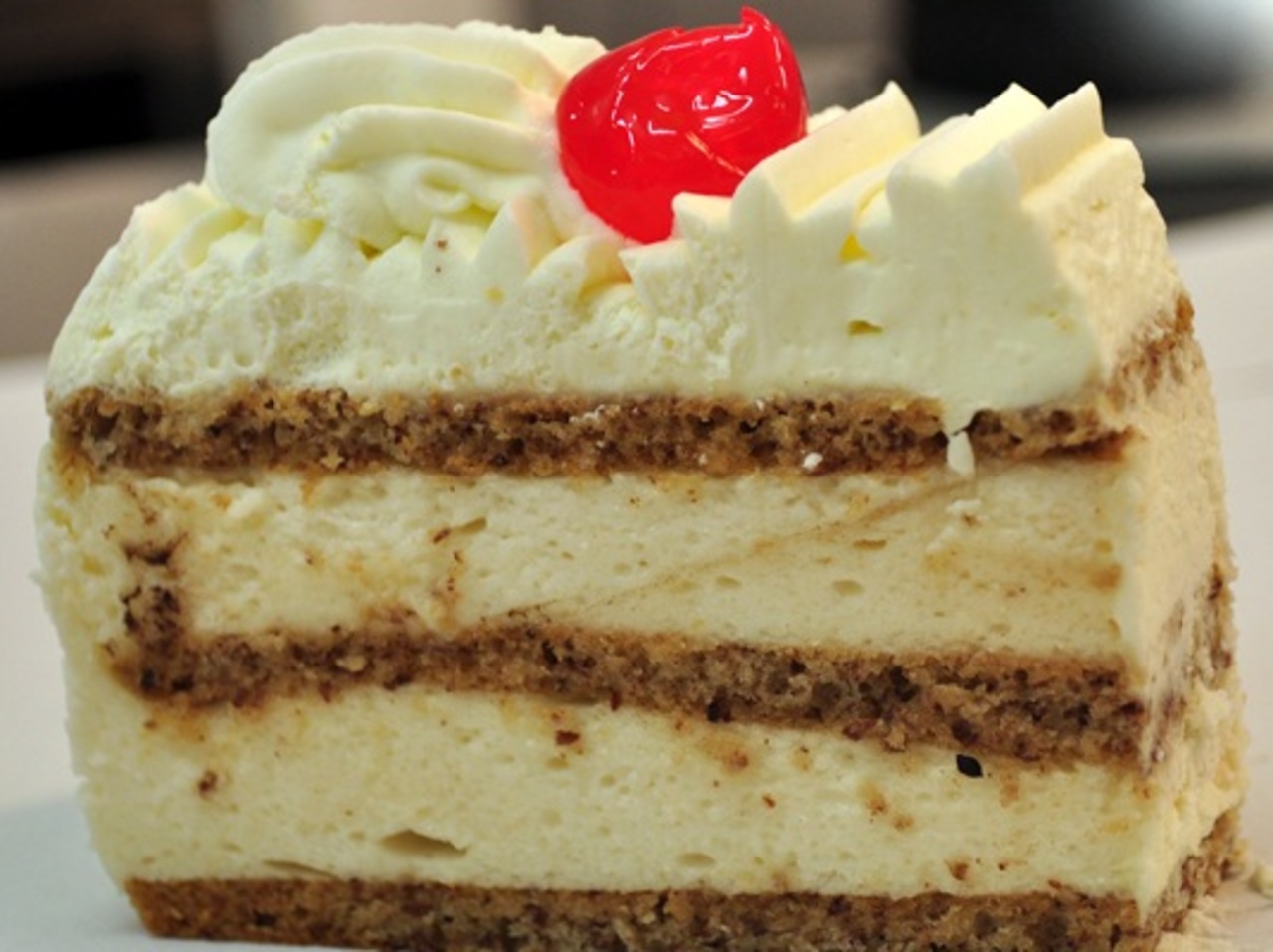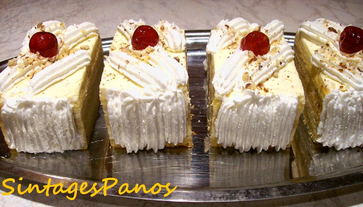Τέλος βάζουμε και το τρίτο παντεσπάνι, και το σιροπιάζουμε και αυτό. Στρώνουμε ένα λεπτό στρώμα σαντιγί, και κόβουμε το γλυκό με λεπτό και πολύ κοφτερό μαχαίρι, στα τέσσερα, δηλαδή να έχουμε 4 κομμάτια 20×8 εκ.