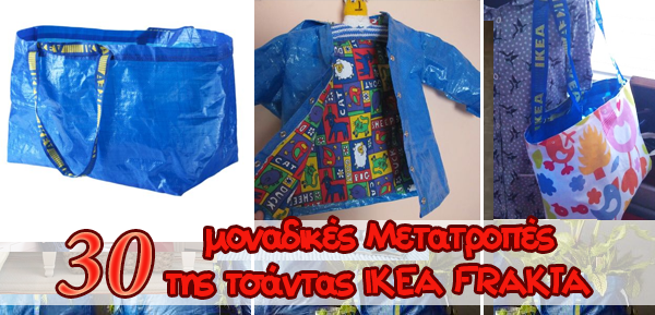 Σίγουρα οι περισσότεροι από εσάς θα γνωρίζετε αυτή τη μεγάλη, ανθεκτική και αδιάβροχη, επαναχρησιμοποιούμενη τσάντα της Ikea. Και φυσικά για τους περισσότερους είναι απλά μία τσάντα που χωράει πολλά! Υπάρχει όμως και μια μερίδα ανθρώπων που επάνω σε αυτή τη τσάντα εξάντλησαν όλη τη δημιουργικότητα τους! Η συγκεκριμένη τσάντα και οι μετατροπές της κερδίζουν όλο και περισσότερο έδαφος στο εξωτερικό και φυσικά έχει γίνει τάση. Δείτε παρακάτω μερικές πανέξυπνες και πρακτικές ιδέες για την μετατροπή της!
